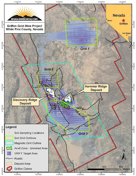 APEX Geoscience (USA) Ltd. of Reno, NV, has been engaged to carry out the first components of the Fall 2025 exploration program, which will focus on the high priority target areas defined by A.I. predictive modelling by VRIFY Technology Inc. (“VRIFY”, see Nevada Sunrise news release dated September 9, 2025), including the unmined area south of the Hammer Ridge open pit (the “Anvil Zone”) to help define a potential signature from a known gold occurrence (see Figure 1). in progress includes: