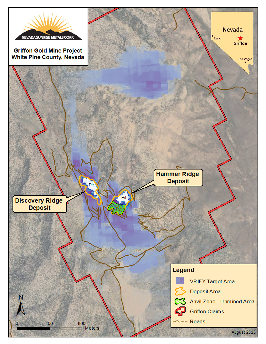 Vancouver, British Columbia, Canada – September 9, 2025 – Nevada Sunrise Metals Corporation (TSXV: NEV, OTC-P: NVSGF) (“Nevada Sunrise” or the “Company”) is pleased to announce that it has deepened its partnership with VRIFY Technology Inc. (“VRIFY”) by leveraging DORA, VRIFY’s AI-Assisted Mineral Discovery Platform, to identify new target areas at the Griffon Gold Mine Project (“Griffon”, or the “Project”) in Nevada, USA. In February 2025, the Company entered into a mining lease to purchase Griffon from an arm’s-length party (see Nevada Sunrise news release dated February 20, 2025). Gold was mined at Griffon in two open pits from 1998 to 1999 and was reported to have produced 62,661 ounces of oxide gold until its premature closure in 1999, a year when the price of gold averaged approximately US$278 per ounce.1