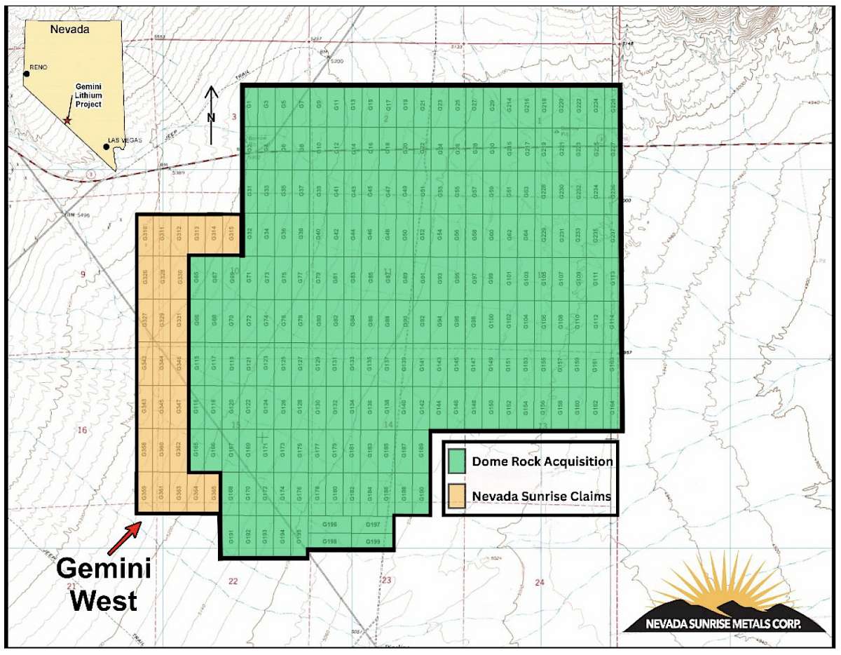 Nevada Sunrise originally acquired its former Gemini Lithium Project by claim staking in 2015, which grew in size by additional staking 280 unpatented claims by 2024 totaling approximately 5,600 acres (2,2,266 hectares).